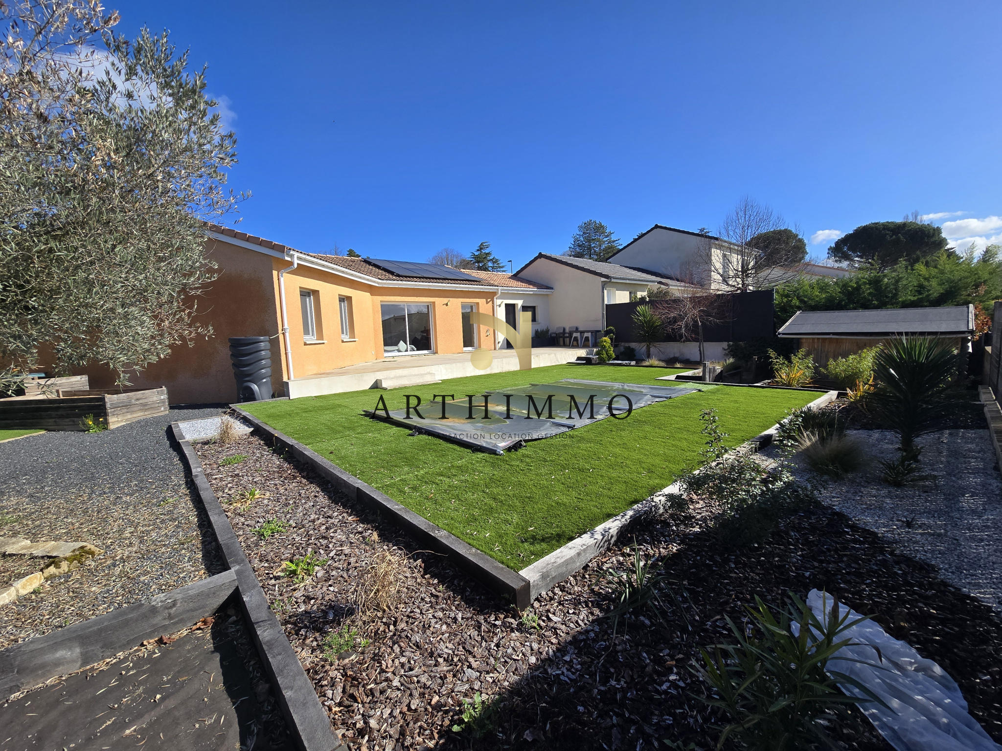 à PEYRINS proche centre maison de plain-pied construite en 2014 avec une extension en 2022 pour obtenir 109 m² de surface habitable composée d'un hall d'entrée avec un espace bureau un séjour salon lumineux 31 m² donnant côté Sud sur une terrasse 7,50 m² une cuisine équipée meublée 8,67 m² une suite parentale16 m² avec dressing salle d'eau et un w-c.un second espace nuit indépendant avec 3 chambres de 9 à 10 m² une salle de bain avec w-c..5,57 m² Terrain entiérement paysagé avec goût de 680 m² une piscine 5 x 3 un espace salon de jardin et un espace potager. DPE : A 55 - A 1 estimations des coûts d’énergie annuels entre 540 E et 770 E chauffage pompe à chaleur clim réversible TF 1 119 € Trés bonnes prestations panneaux photovoltaiques une borne de recharge pour véhicule élestrique le rêve avec ette ambiance des maisons du Sud de la France mais faites vite pour la visiter ! Prix : 333 000 Euros